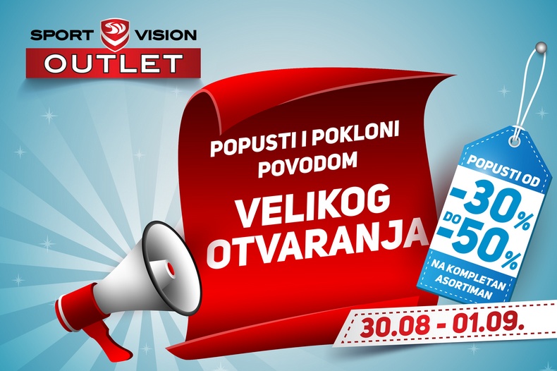 Podgorica će od 30. avgusta postati modernije i atraktivnije mjesto za šoping. Naime, u prvom retail parku u Crnoj Gori – EXTRA retail parku, od 9 časova, svečano će biti otvoren do sada najsavremeniji Sport Vision OUTLET u Crnoj Gori, sa nevjerovatnom ponudom vaših omiljenih sportskih brendova, po još nevjerovatnijim cijenama. A kako bi užitak bio potpun, spremili smo i brojna iznenađenja za posjetioce – popuste na dan otvaranja od 30 do 50%, kao i poklone!